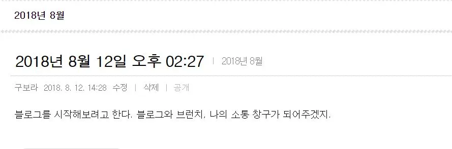 그런 공간이 있었다. 블로그. 브런치는 2018년 7월 무렵부터 시작했고 (첫 글을 보니), 블로그는 2018년 8월 12일 오후 2시 27분 저 글을 쓰며 시작했다.