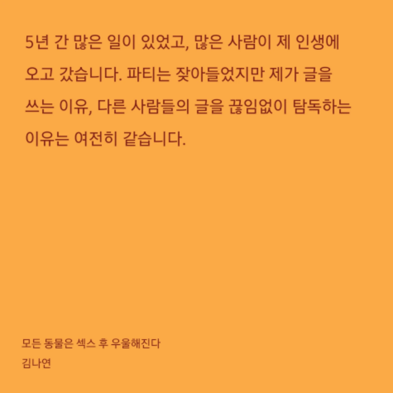 5년 간 많은 일이 있었고, 많은 사람이 제 인생에 오고 갔습니다. 파티는 잦아들었지만 제가 글을 쓰는 이유, 다른 사람들의 글을 끊임없이 탐독하는 이유는 여전히 같습니다.
