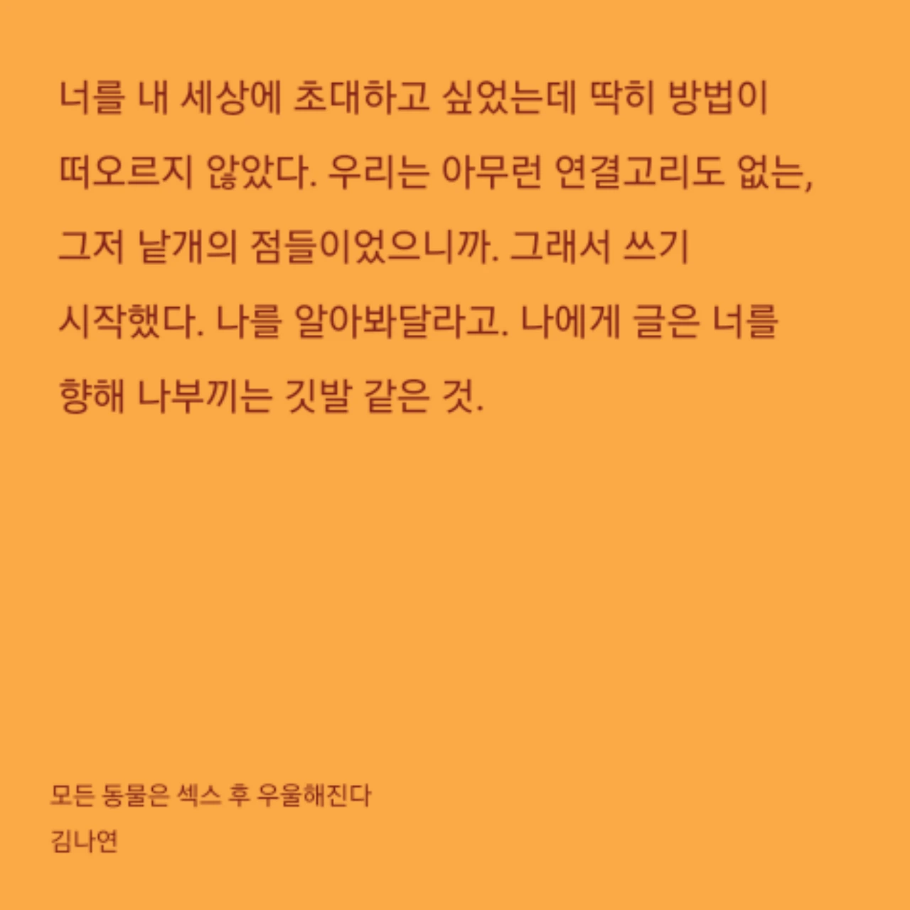 너를 내 세상에 초대하고 싶었는데 딱히 방법이 떠오르지 않았다. 우리는 아무런 연결고리도 없는, 그저 낱개의 점들이었으니까. 그래서 쓰기 시작했다. 나를 알아봐달라고. 나에게 글은 너를 향해 나부끼는 깃발 같은 것.'