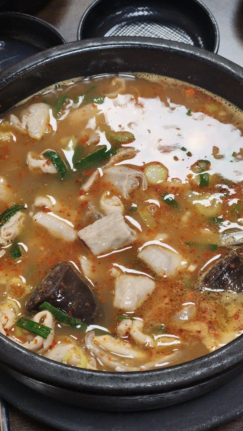 국밥을 한 숟갈 떠서 먹는데 캬 이 맛이지, 싶고 정말 맛있었다. 정말 내가 좋아하는 맛. 얼큰함 그 자체. 얼큰하고 시원하고. 이 순대국밥은 처음부터 매콤하게 되어있다. 경상도 돼지국밥의 경우에는 처음엔 뽀얀데 다대기를 본인의 취향껏 넣는다.