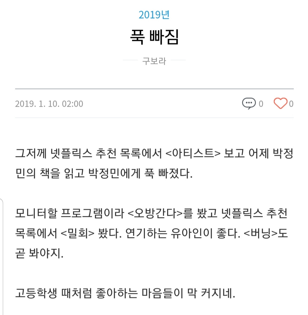 블로그 글 중에서 마지막 문장이 와닿는다. ‘고등학생 때처럼 좋아하는 마음들이 막 커지네’라는. 고등학생 땐, 좋아하는 게 은근히 많았던 것 같다. 좋아하는 밴드, 좋아하는 소설가, 좋아하는 영화, 좋아하는 웹툰, 좋아하는 배우. 누가 툭 물어보면 툭 대답할 수 있는 그런 상태? (누군가 물어봐주길 은근히 바라면서. 하하)