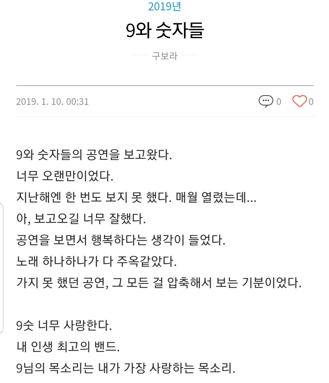 ‘9님의 목소리는 내가 가장 사랑하는 목소리’라고 적어두었는데, 저 때는 팬심이 가장 컸을 때인 것 같다. 음, 지금은 그 정도는 아니다. 9와 숫자들을 좋아한 지 9년쯤 되었다. 오랫동안 그들을 좋아한 비결은? 많이 좋아하지 않아서. 모순적인가. 은은하게 늘 좋아하지만, 빠져있을 땐 훅 빠지지만. 내가 살기 바쁘면 전혀 관심을 두지 못 했다. 9와 숫자들만큼 좋아하는 밴드(음악도 듣고, 공연도 가는)는 그다지 없었지만. 그럼에도 관심을 안/못 가질 때도 있었다.