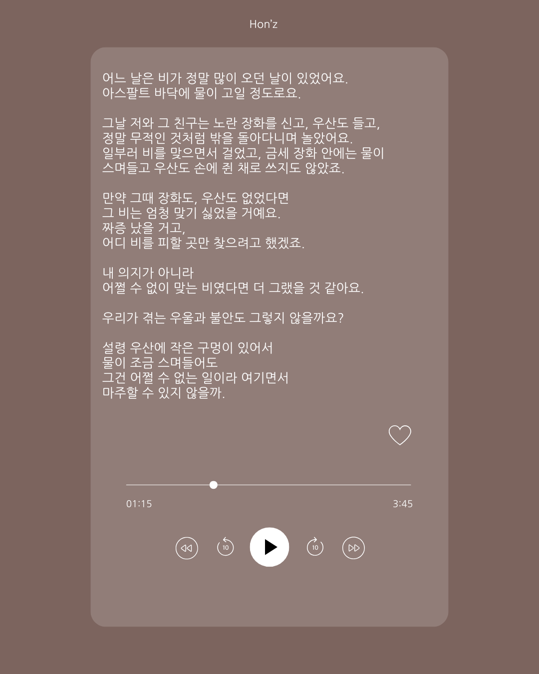 어쩔 수 없이 맞는 비였다면 더 그랬을 것 같아요.