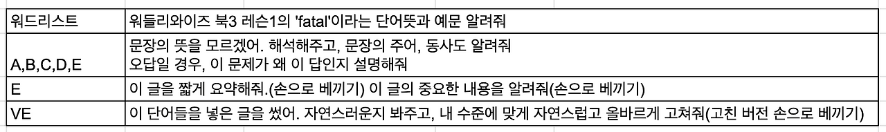 워들리와이즈라는 책은 단어를 세밀하게 공부하는 어휘집이다. 단순히 단어를 다 열해 놓은 단어집이나 단어장이 아니라 한 레벨당 15-20 챕터가 있고, 한 챕터당 10개의 단어가 있다. 이 10개의 단어를 A~E까지 간단한 문제 풀이와 유사어 확인, 단어를 활용한 문장 쓰기의 활동 등을 통해 단어에 대해 알차게(?) 익히는 과정이 교재의 구성이다. 이 과정안에서 영어에 능통한 선생님의 수정이 필요하고, 제대로 익히기 위한 점검도 중요하다. 영어에 능통한 선생님의 수정과 문제를 풀면서 모르는 부분에 대한 질문 담당은 챗gpt에게, 제대로 익혔는지 점검하는 것은 부모 또는 그 외 점검역할을 할 수 있는 사람이 해준다면, 비용 소요가 크지 않게 아이들이 영어 공부를 스스로 해볼 수 있다. 물론, 공부하는 중에 여러 부분 어려운 지점이 있겠지만, 수정해 가면서 챗gpt와 스스로 공부해 나가는 방법을 익힐 수 있다.