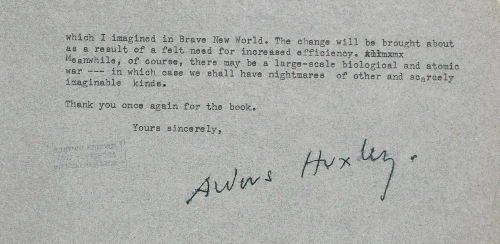 In October of 1949, a few months after the publication of George Orwell’s dystopian masterpiece, Nineteen Eighty-Four, he received a letter from fellow author Aldous Huxley, who, 17 years earlier, had seen his own political dystopia published, in the form of Brave New World. Having recently finished reading Orwell’s novel, Huxley had a few words to say. What begins as a letter of praise soon becomes a brief comparison of the two novels, and an explanation as to why Huxley believes his own book to be a more plausible prediction of the future.