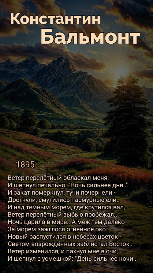 위에 덧붙여 올린 이미지 속의 시는 꼰스딴찐 발몬뜨(Konstantin Balmont)가 1895년에 발표한 <떠도는 바람(Ветер перелётный)>입니다. 앞서 읽었던 시와 비슷한 제목(혹은 연작)이지만 내용은 다르며, 밤과 낮의 대립과 순환을 아름다운 음악적 언어로 노래한 작품입니다. 원문의 리듬과 분위기를 살려 번역해 드립니다.