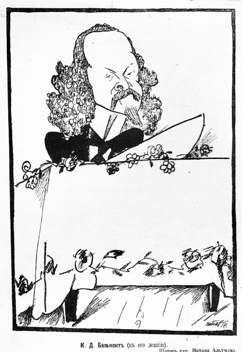 강연하는 시인: 하단의 텍스트(К. Д. Бальмонт (къ его лекціи))에서 알 수 있듯, 강단 뒤에서 청중을 압도하며 강연하거나 시를 낭송하는 모습을 담았습니다.