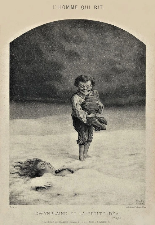 한 소년이 눈보라가 치는 영국 해변에 버려집니다. '콤프라치코스(Comprachicos)'라 불리는 범죄 집단이 그의 입꼬리를 귀밑까지 찢어 놓아, 평생 웃는 얼굴로 살도록 흉측하게 성형한 뒤였죠. 소년은 죽음의 문턱에서 얼어 죽은 어머니의 품에 안긴 아기 소녀를 발견합니다. 그는 아기를 들어 올립니다. 그렇게 그윈플레인과 데아의 여정은 눈 속에서 시작됩니다.