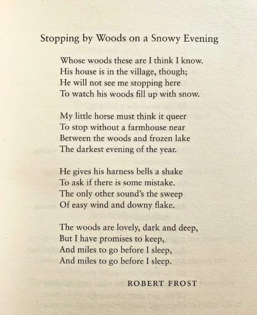 His famous poem ""Stopping by Woods on a Snowy Evening"" ends: ""The woods are lovely, dark and deep, / But I have promises to keep, / And miles to go before I sleep.""