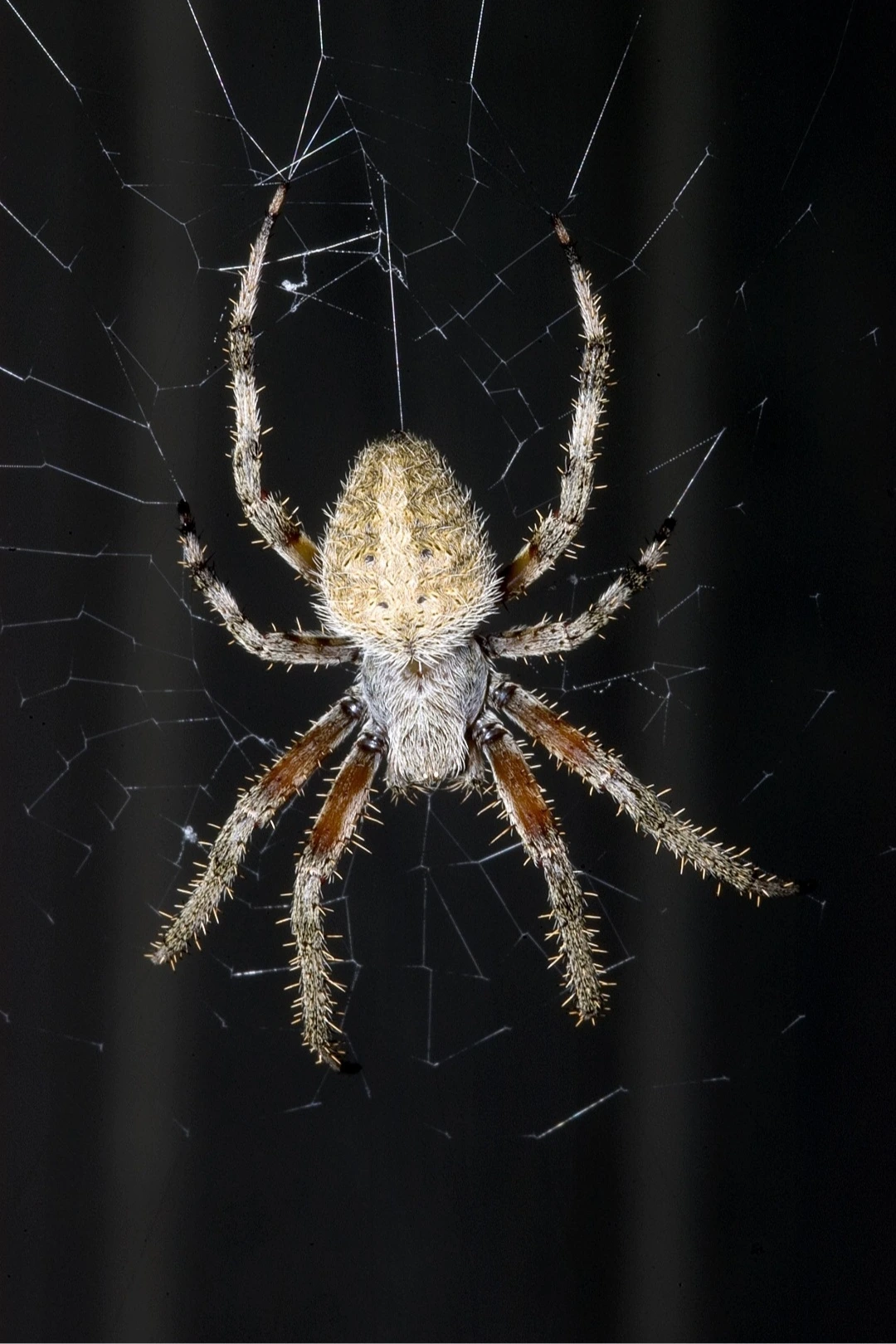 Gertsch told him: Araneus cavaticus — the common barn orb weaver. Poor eyesight. Hunts at night. Detects prey through vibrations in the web. Lives one season, lays her eggs, and dies.
