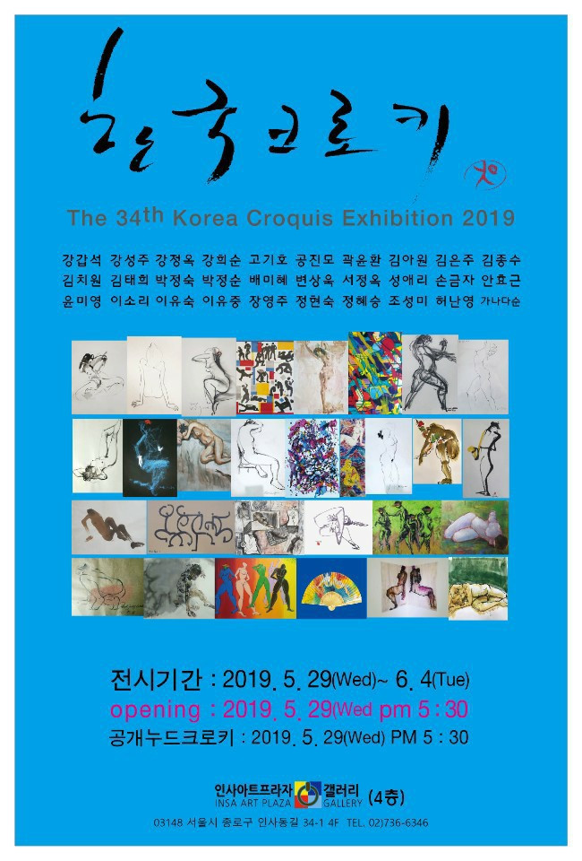 제34회 한국크로키회 정기전이 2019년 5월 29일부터 6월 4일까지 인사아트프라자갤러리 4층에서 열렸다. '한국크로키회'는 1985년을 시작으로 매년 회원들의 단체전과 공개누드크로키 행사를 연다. '한국크로키회'는새롭게 변화된 회원들의 작품을 정기전을 통해 해마다 선보이며 꾸준히 발전해 왔다. 이번 전시에는 29명의 회원 작품이 전시됐다.
