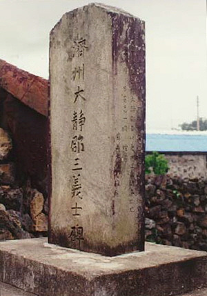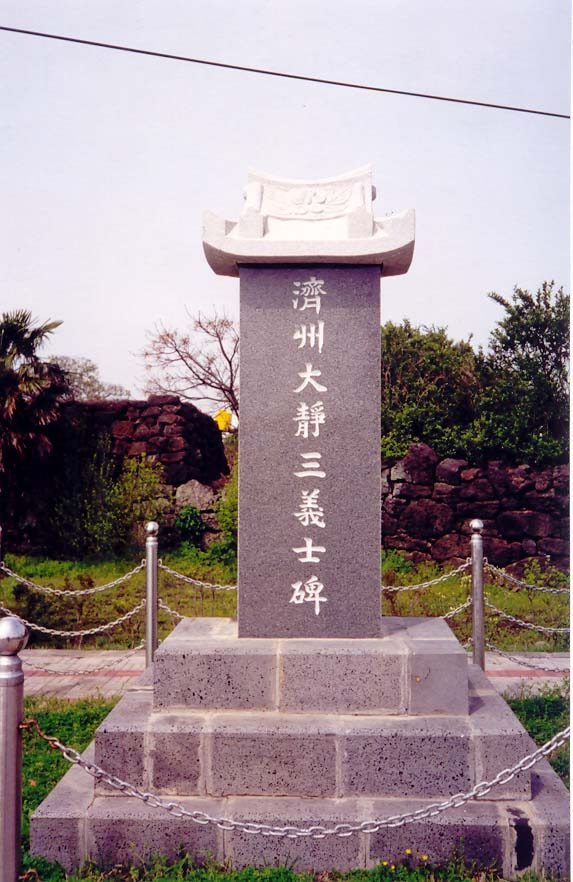 一九六一년 辛丑에 향민들이 정성을 모아 「濟州大靜郡三義士碑」를 대정고을 홍살문 거리에 세웠던 것이 도로확장 등 사정으로 옮겨 다니며 마모되고 초라하여 이제 여기 대정고을 청년들이 새 단장으로 비를 세워 후세에 기리고자 한다.‘