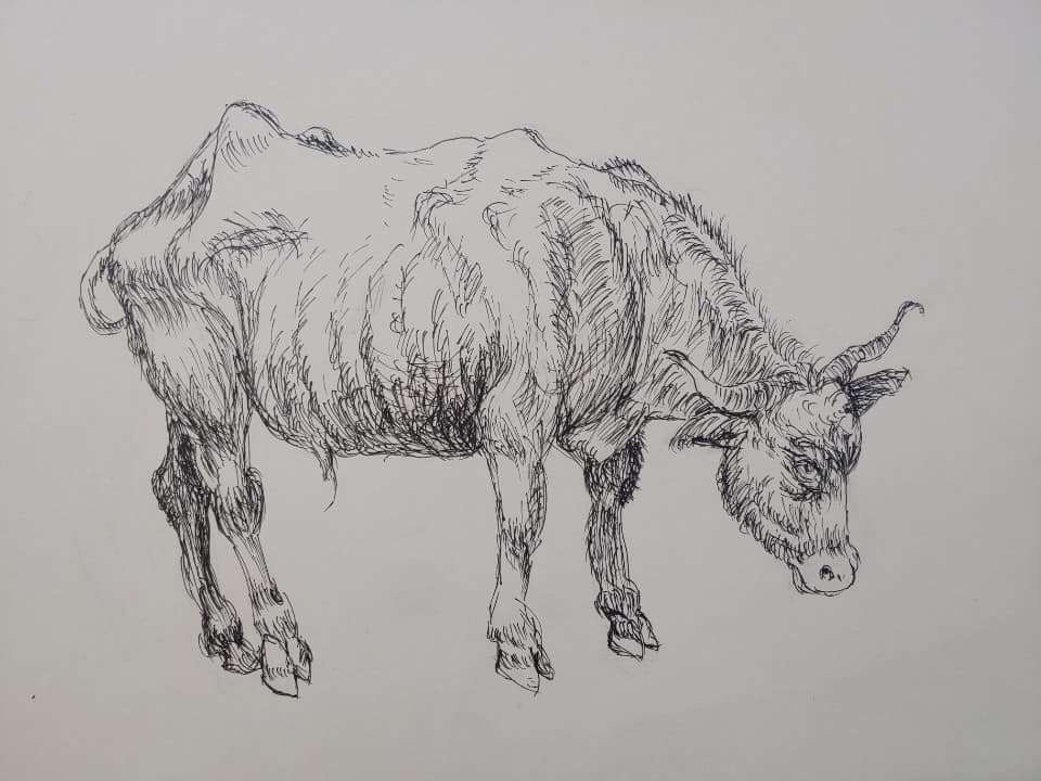 *네 발 달린 것들은 그리기 쉽지 않다. 그럭저럭 그렸다. 명암 묘사를 더 보충하라는 선생님의 지도를 받았다. 빛은 소의 궁둥이에서 사선(斜線)으로 내려오고 있다.