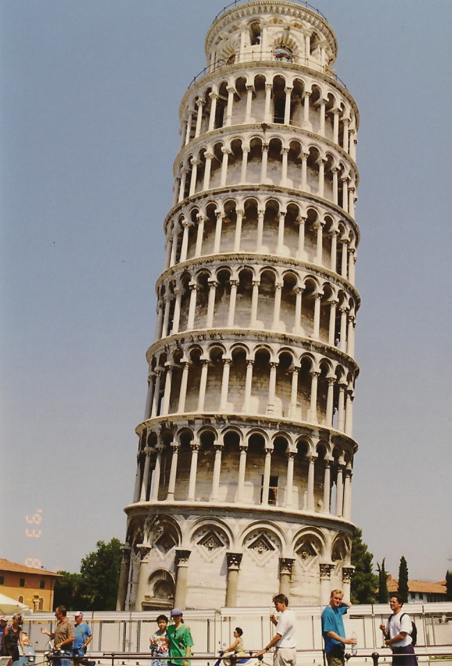 피사의 성당 복합체 가운데 3번째이며 마지막인 구조물로 1174년에 착공된 이 종탑은 56m 높이로 설계되어 흰 대리석으로 지어졌다. 건물의 기초부가 무른 땅속으로 기울어지게 가라앉는 것을 발견한 때는 이미 전체 8층 중 3층까지 완공되어 있었다. 책임 기술자였던 본나노 피사노는 기울어진 모양을 보정하기 위해 새로 층을 올릴 때 기울어져 짧아진 쪽을 더 높게 만들었으나, 추가된 석재의 무게로 건물은 더욱 가라앉게 되었다. 기술자들이 해결방안을 찾으려고 몇 번씩 공사를 중단했으나 결국 14세기에 맨 꼭대기 층이 기울어진 채 완성되었다. 근대에 들어서 기초에 액상 시멘트를 주입해 보강했음에도 20세기 후반까지 여전히 붕괴의 위험이 있어 사탑을 구하기 위한 다양한 계획이 구상되고 있다.