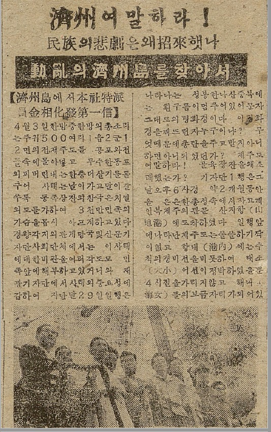 4월 3일 한밤중의 총소리는 주위 500여 리 4읍 2군 12면의 전 제주도를 공포와 전율 속에 몰아넣고 무수한 동포의 피비린내는 한층 더 살기를 돋구어 사태는 날이 가고 달이 갈쑤록 동족상잔의 참극은 치열의 도를 가하여 3천만 민족의 가슴을 몹시 아프게 하고 있다. 경향 각지의 관계 당국 및 신문기자단 사회단체에서는 이 사태에 대한 비판을 여러 각도로 민족 앞에 해부하고 있거니와 재광기자단에서 사태의 중요성에 감하여 지난달 29일 일행은...