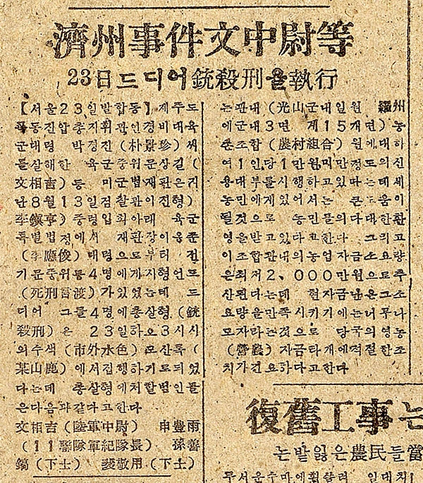그에 뒤이어 1948년 9월 25일 자 2면에 보도된 문상길 중위의 사형집행 기사가 소개되었다. ‘제주사건 문 중위 등 23일 드디어 총살형을 집행’이라는 제목의 짤막한 기사였다. 기사 내용은 ‘제주도 폭동 진압 총지휘관인 경비대 육군 대령 박경진을 살해한 육군 중위 문상길 등 4명을 23일 총살했다’라는 것이다. 이는 대한민국 정부 수립 후 제1호 사형집행이었다.