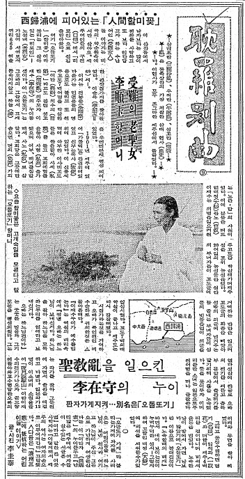 내가 오돌또기(할미꽃)라 불리는 노성녀(老聖女)를 서귀포에서 수소문한 것도 한국 여인이 살아온 하나의 자세를 더듬어 보고 싶은 뜻에서였다. 서귀포 사람들은 거의 이 오돌또기 할멈을 모르고 있었으며 그의 오빠 이재수가 60년 전에 저지른 반란에 대해서도 전혀 모르고 있었다. 그저 이름을 알고 있었기에 동회를 쫓아다니며 명부를 뒤져보고 바닷가 가까운 구멍가게를 찾아 들었다. 서귀포시 서귀리 665번지¹에 사는 이순옥 씨. 이재수의 누이, 나이는 일흔셋²이었다.