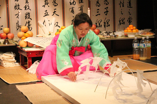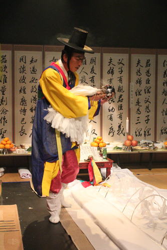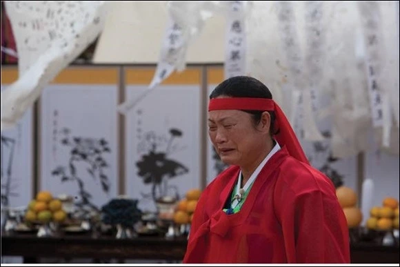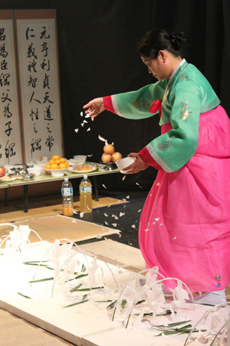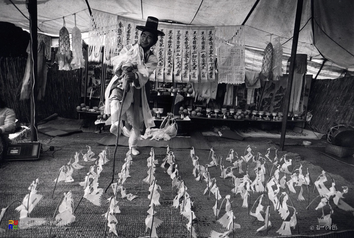 제주도 무당굿 중 시왕을 맞아들여 기원하는 시왕맞이 중 차사영맞이 모습. 저승길을 치워 닦아 시왕의 하위신인 차사와 죽은 영혼을 맞아들이는 제차로 질침이라고도 한다. 1982년 제주시 구좌읍 김녕리, 김수남 사진.