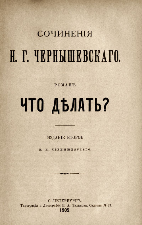 『무엇을 할 것인가?』(Что Делать?)는 하나의 혁명적 선전으로 당대의 급진적인 젊은 독자들과 후대의 혁명가들에게 지침이 되었던 작품이다. 『무엇을 할 것인가?』는 베라 파블로브나라는 젊고 똑똑한 중산층 계급의 여자가 잡계급(разночинцы) 지식인 출신의 로푸호프와 그의 친구 키르사노프를 만나 지적, 사회적, 혁명적으로 성숙해 가는 성장소설로, 꿈같은 이상향을 만들기 위해 무엇을 어떻게 해야 하는지를 구체적으로 가르쳐 준다.