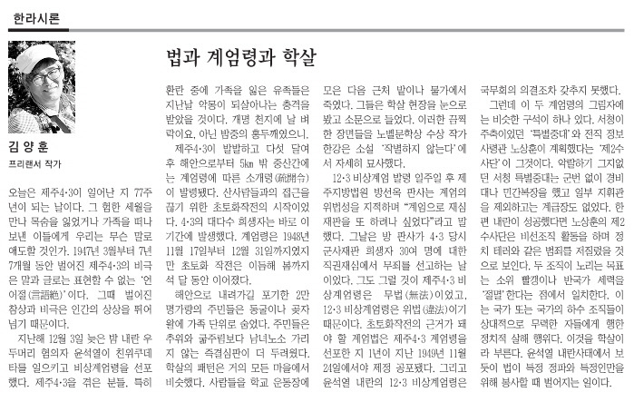 2025년 4월 3일 한라일보 <김양훈의 한라시론>