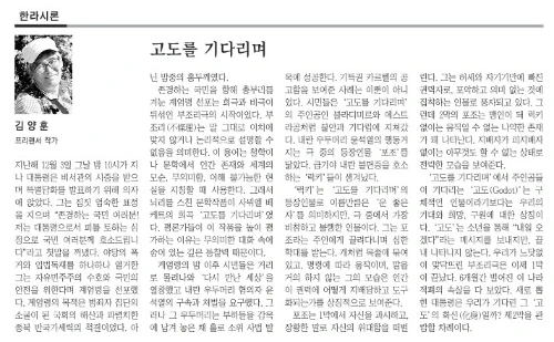 『고도를 기다리며』에서 주인공들이 기다리는 ‘고도(Godot)’는 구체적인 인물이라기보다는 우리의 기대와 희망, 구원에 대한 상징이다. ‘고도’는 소년을 통해 "내일 오겠다"라는 메시지를 보내지만, 끝내 나타나지 않는다. 우리가 느닷없이 맞닥뜨린 부조리극은 이제 1막이 끝났다. 6개월간 벌어진 이 나라 적폐의 속살을 다 보았다. 새로 뽑힌 대통령은 우리가 기다린 그 ‘고도’의 화신(化身)일까? 제2막을 관람할 차례이다.