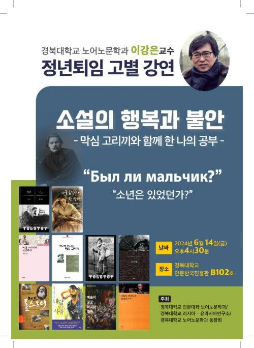 이강은 교수(경북대학교 노어노문학과, 2024년 정년 퇴임)가 최근 발표한 저술과 연구 성과의 일관성은 고리키와 톨스토이 등 러시아 리얼리즘 전통을 중심으로 ‘화자·서사·윤리·미학’을 이론적으로 결합하려는 데에 있다.
