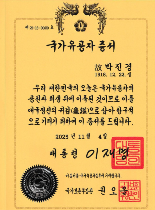 박진경은 부임 40여일만인 1948. 6. 18. 부하들에게 암살당합니다. 28살 나이였고, 자녀 없이 죽었습니다. 현재 ‘박진경 유족’이라고 말씀되는 분들은 양아들, 양손자입니다. 박진경에게 1950년 을지무공훈장이 수여되었는데, 왜 75년이 지난 올해 10월에 갑자기 유족의 국가유공자신청이 있었던 걸까요?