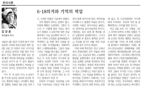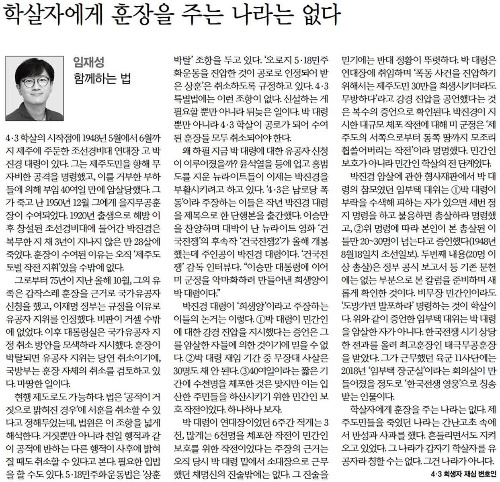이번텀 한겨레 칼럼. 제주4·3 강경진압을 주도했던 박진경 대령에 대한 서훈을 박탈해야 한다는 내용으로 썼습니다. 최근 정부가 박진경 대령에게 국가유공자 지위를 인정해서 논란이 컸죠.