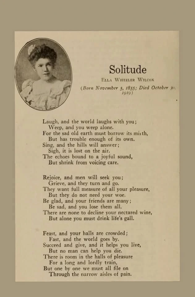 이 시는 미국의 시인 엘라 휠러 윌콕스(Ella Wheeler Wilcox)의 가장 유명한 작품인 "고독(Solitude)"이다.