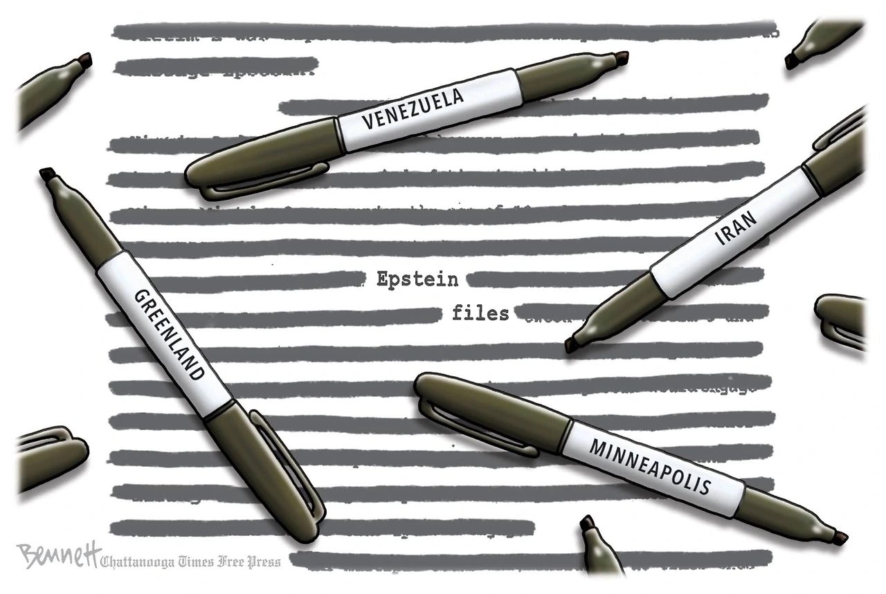 카툰의 배경에는 'Epstein files(엡스타인 파일)'이라는 문구가 적힌 문서가 놓여 있다. 하지만 문서의 대부분은 검은색 마커로 칠해져 읽을 수 없게 되어 있다. 이는 권력층의 추문이나 사회적 파장이 큰 사건의 핵심 정보가 국가 기밀이나 수사상의 이유라는 명목하에 검열(Redaction)되고 있음을 상징한다.