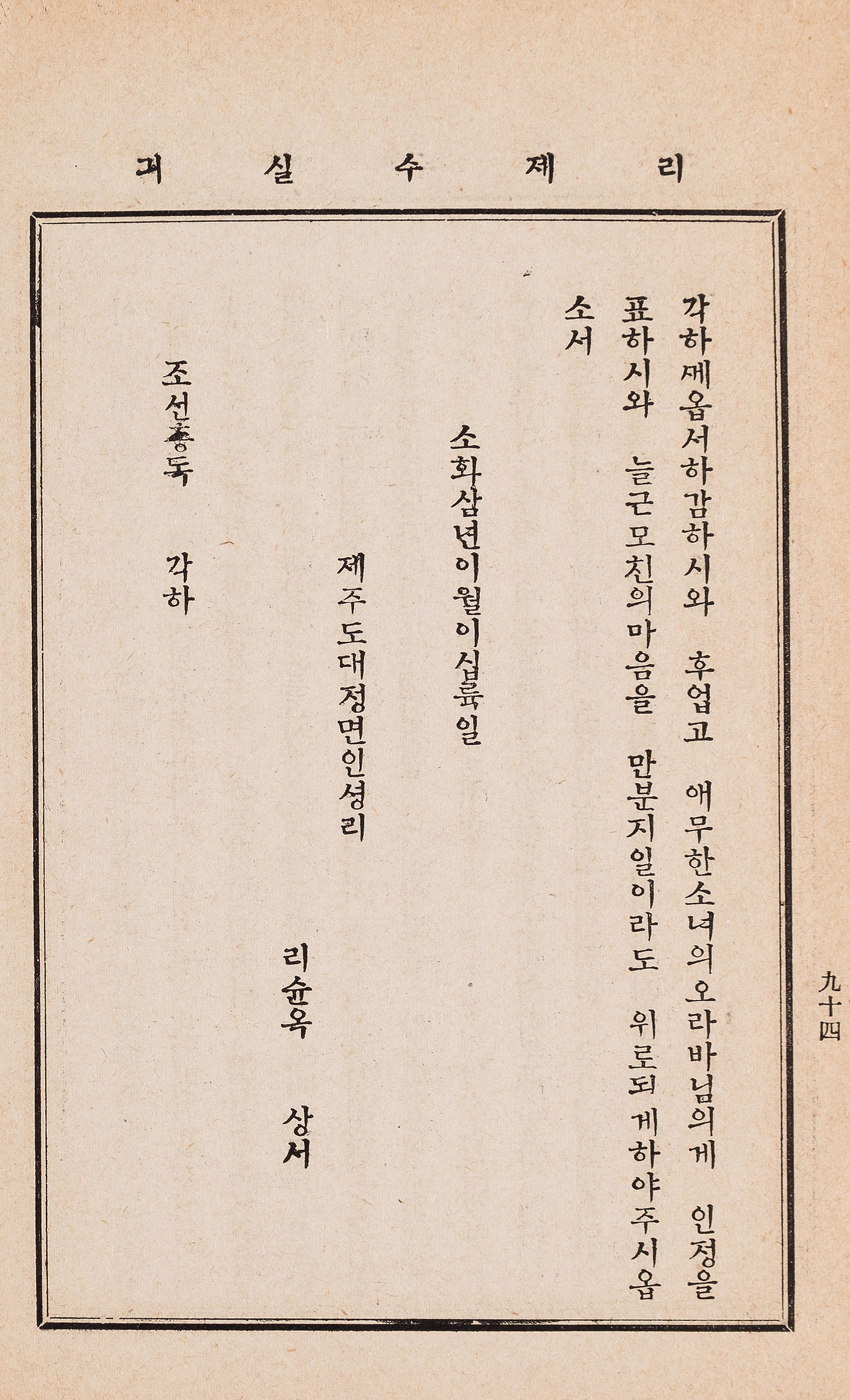 신축년 제주민중항쟁의 장두 손아래 누이 이순옥은 오빠의 의거를 널리 알리기 위해 이재수의 실기 ’야월(夜月)의 한라산‘을 준비했다. 그녀는 국내에서 자신의 책을 출간할 방법이 없자 오사카로 건너가 바느질 등 갖은 고생을 하면서 돈을 모은 후 한경면 낙천리 훈장 출신 조무빈(趙武彬) 선생을 찾아갔다. 그녀의 구술원고를 다듬은 조무빈 선생은 1931년 오사카에 있는 중도문화당(中島文華堂)에서 <야월의 한라산-이재수의 실기>를 출판할 수 있도록 도움을 주었다.