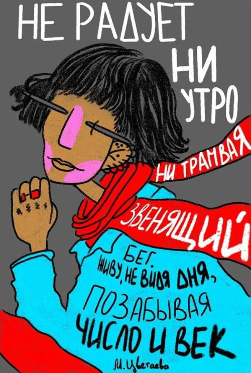 그림 속 인물의 짧은 단발머리는 실제 마리나 츠베타예바의 상징적인 헤어스타일을 묘사한 것입니다. 현대적인 팝아트 스타일로 그려진 이 삽화는, 100년 전의 고전 시(詩)가 오늘날에도 여전히 현대인의 고독과 맞닿아 있음을 시각적으로 보여주고 있습니다.