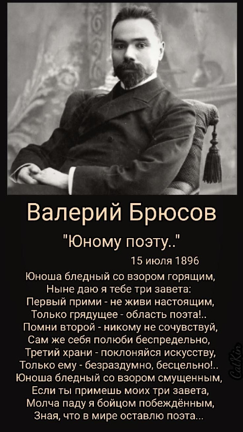 이미지 속의 인물은 러시아 상징주의 문학의 거두인 발레리 브류소프(Valery Bryusov)이며, 텍스트는 그의 대표적인 시 "젊은 시인에게(Юному поэту)"입니다. 이 시는 예술을 위한 예술, 즉 탐미주의의 정수를 보여주는 작품으로 유명합니다.
