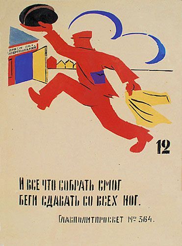 *내용의 목적: 당시 소련 정부는 군대와 굶주리는 도시 노동자들을 지원하기 위해 식량이나 물자를 수집(공출)하고 있었습니다. 이 포스터는 시민들에게 "무엇이든 모은 것이 있다면 지체하지 말고 기부(납부)처로 달려가라"는 메시지를 던지고 있습니다.