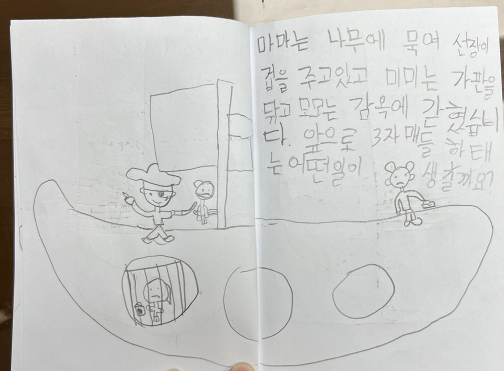 미미는 가판을 닦고 모모는 감옥에 갇혔습니다.