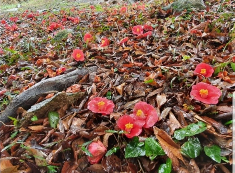 듬직한 초록 잎사귀에 보듬긴 동백꽃이 나를 내려 보고 수군거린다.