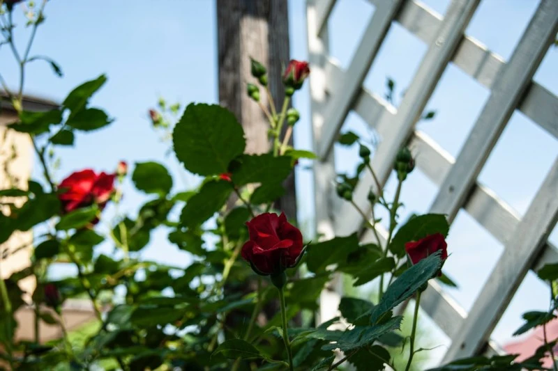 장미 꽃봉오리는 울타리에 기대었다 어느새 검붉게 피어난다.