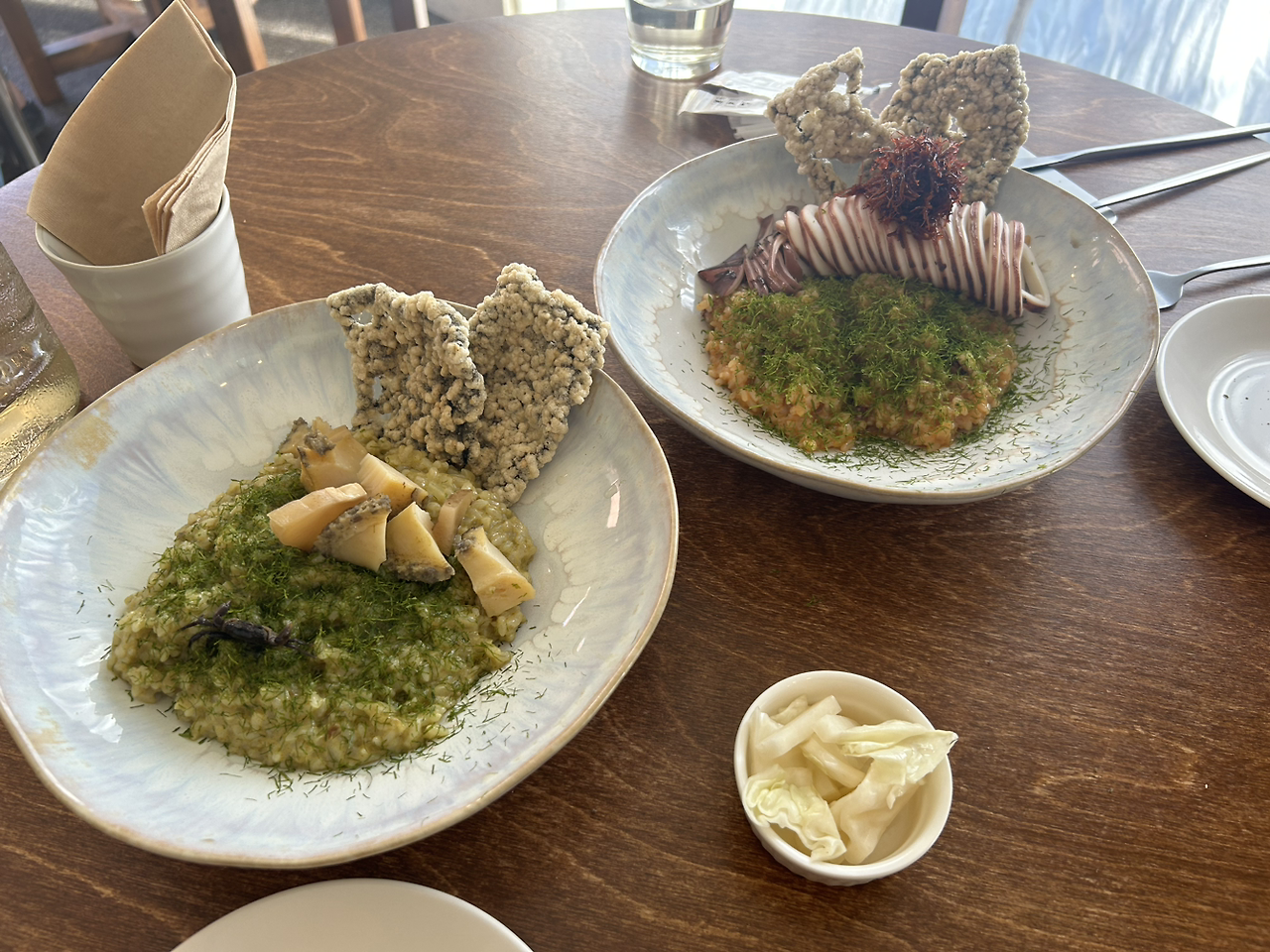 속초 맛집이라고 검색하면 누구나 한번쯤은 들어보았을 법한 장소! 내가 학교에 적응할 때 많이 의지가 되었던 친구가 알려주었다. 학급 경영과 관련된 다양한 조언을 들으며 속초고의 신규교사로서 마음을 다잡게 되는 계기가 되었던 곳이다. 전복리조또에 올려진 자그마한 간장게장이 오독오독 씹히는 것이 은근히 별미다. 리조또는 내장맛이 진하게 나며, 파래가루와 잘 어울려 고소하고 눅진한 맛! 후식으로 나오는 뜨거운 커피를 즉석에서 올려주시는 차가운 판나코타까지 먹어야 개운하다. (추가도 가능하다는 사실은 한참후에야 알았다.)