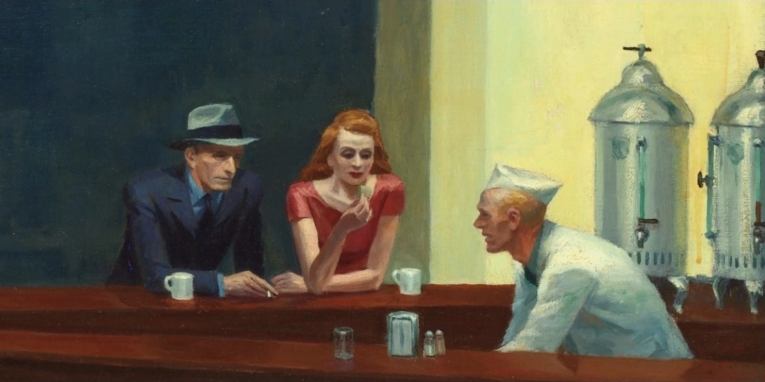 호퍼의 대표작 중 하나인 이 그림은 도시의 다이너(간이식당) 안 몇 명의 인물을 보여준다. 관찰자는 어둠이 짙게 깔린 밖에서 식당 안을 보고 있다. 식당 안의 사람들은 함께지만 혼자이다. 미국 특유의 대중적인 공간에서 커다란 유리를 사이에 두고 안팎이 공유된다. 하지만 안에서도, 밖에서도 그들은 각자 외롭다. 어둠 속의 관찰자와 마찬가지로 빛 속에 있는 그들도 함께지만 혼자다.