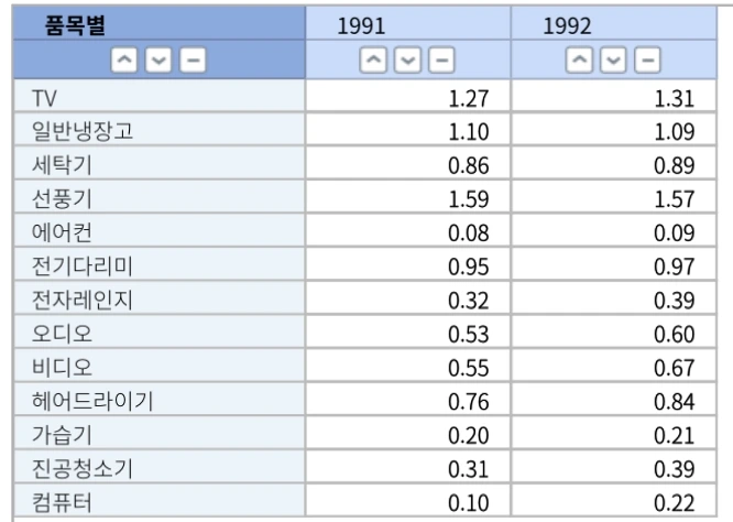 1991, 1992년의 가전제품 보급률(국가통계포털)