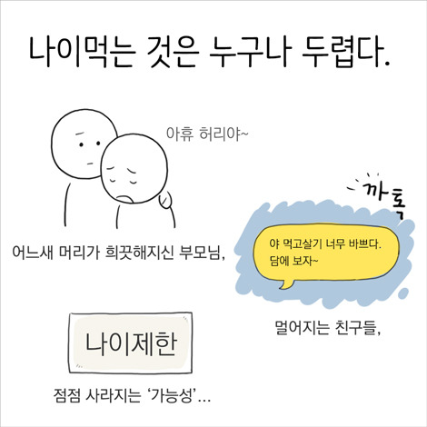 이렇게 모두들 불안함이 커진 것은 아이러니하게도 '늘어난 기대수명'때문이 아닐까요? 한 60살 살면 더 이상 자신을 책임질 필요가 없었던 예전과 달리, 이제는 2~30대 젊은 시간에 100세 인생의 기반을 마련해야 하잖아요. 그렇다 보니 나이 드는 게 무섭죠. 정확히 말하자면 자신의 '생산 가능 시간' 마감일이 한발 한발 다가오는 것이 불안해요.