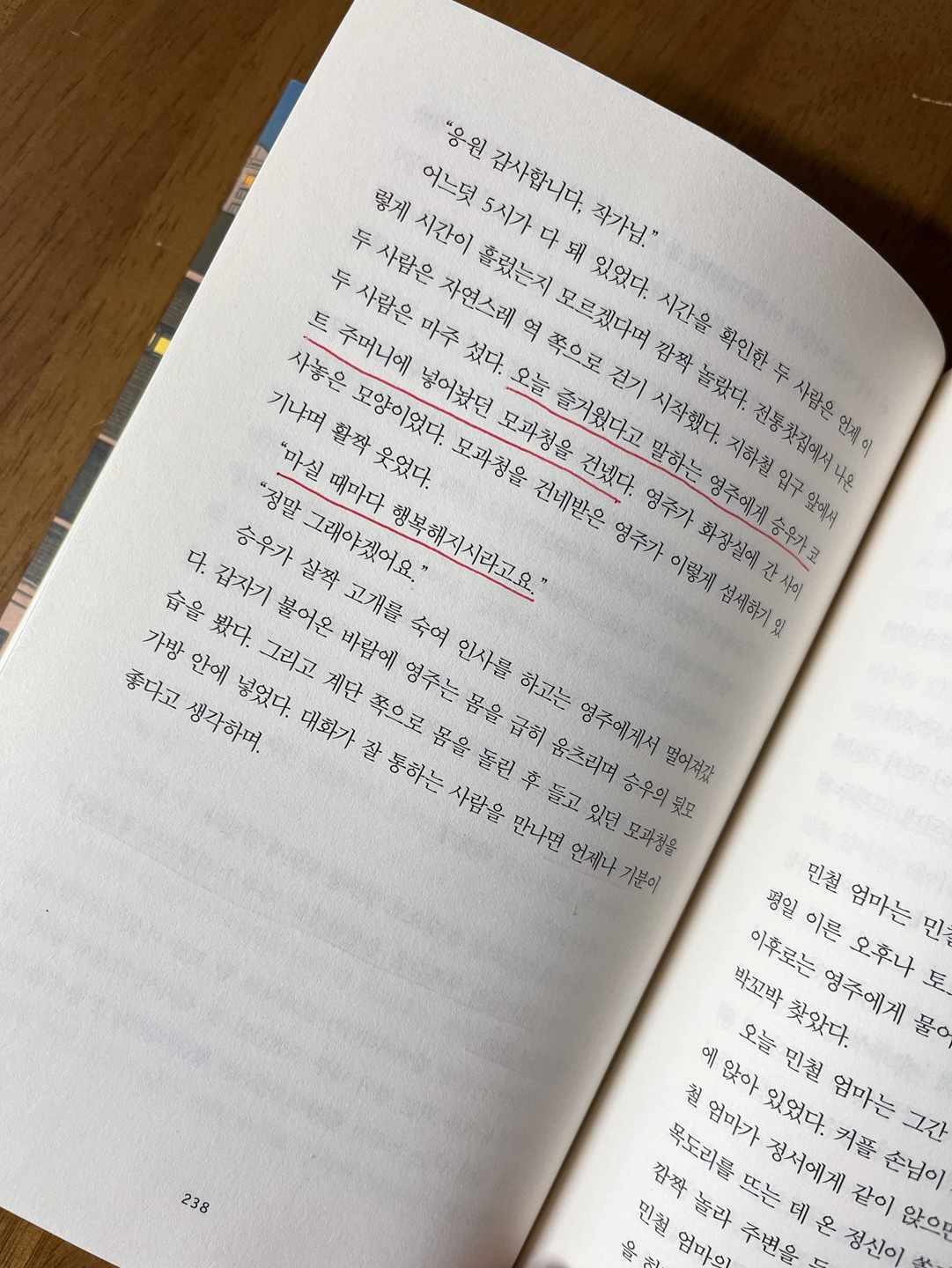 물론 영주가 굳이 승우를 사랑해야 할 필요는 없다. 그럴 필요가 전혀 없긴 하지만, 그래도 소설을 읽다 보면 왠지 모르게 승우를 응원하게 된다. 아마도 그가 보여주는 마음의 변화와 표현의 방식이 꽤 로맨틱해서 그런 듯싶다. 뭐랄까. 타오르듯 열렬하진 않지만, 소박하면서도 진솔하달까. 승우의 모습에선 성숙한 이들만이 보여줄 수 있는 담백하고도 덤덤한 감정이 자주 보인다. 마치 주머니에 넣어 놓았던 모과청처럼 말이다.