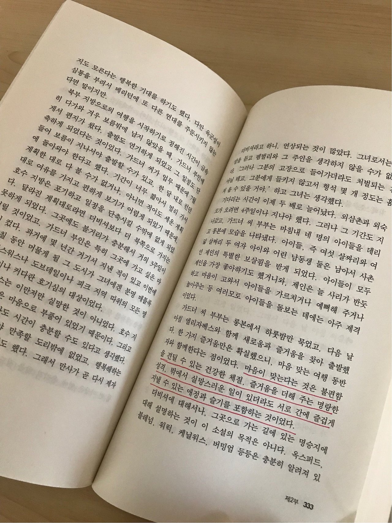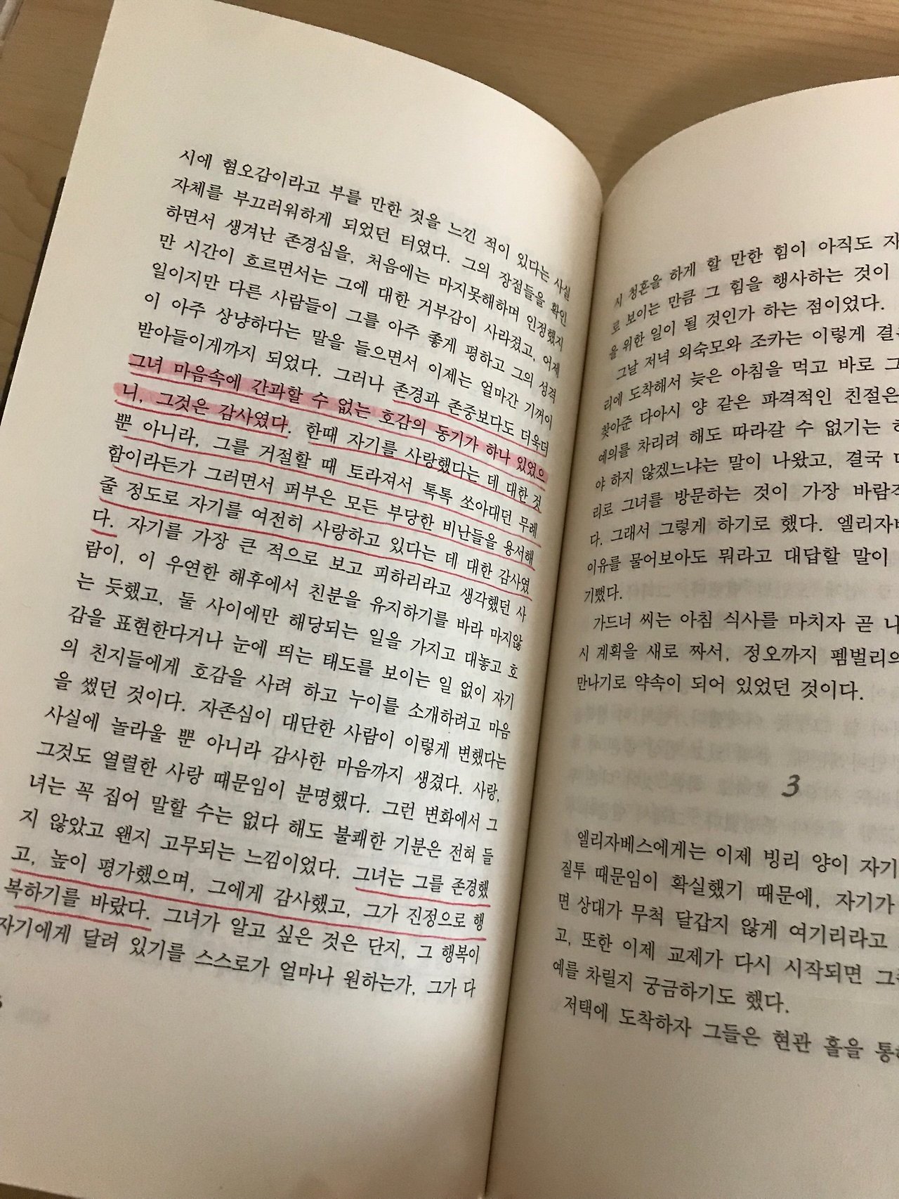 이 소설은 나이대별, 그리고 반복해서 읽은 횟수에 따라 공감하는 부분이 달라진다. 20대 초반 때의 내가 밑줄 그었던 부분과 20대 후반 때의 내가 밑줄 쳤던 부분은 미묘한 차이가 있다. 제인 오스틴이 그린 생각의 흔적들을 따라가며 내 생각의 흔적들을 시기별로 쫓아가는 것도 꽤 잔잔한 즐거움이 된다.