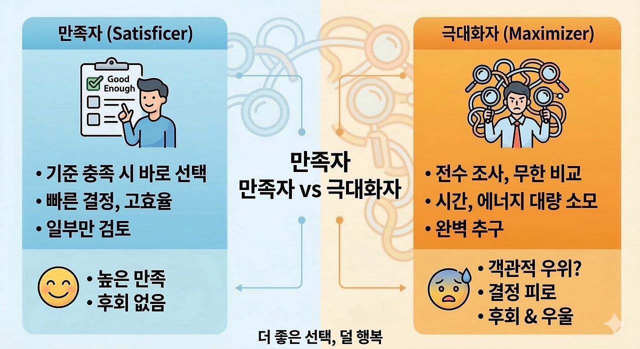앞서 언급한 배리 슈워츠는 인간을 두 유형으로 나누었다. 자기 기준에 맞는 선택지를 만나면 곧바로 결정하는 만족자(Satisficer)와, 가능한 모든 선택지를 비교해 객관적으로 가장 좋은 것을 찾으려는 극대화자(Maximizer)다. 흥미로운 점은 극대화자가 실제로 더 좋은 조건을 얻는 경우가 있음에도 불구하고, 만족도는 오히려 더 낮고 후회와 우울감을 느끼는 빈도가 높았다는 연구 결과다. 더 좋은 것을 골랐는데 더 불행해지는 역설이다.