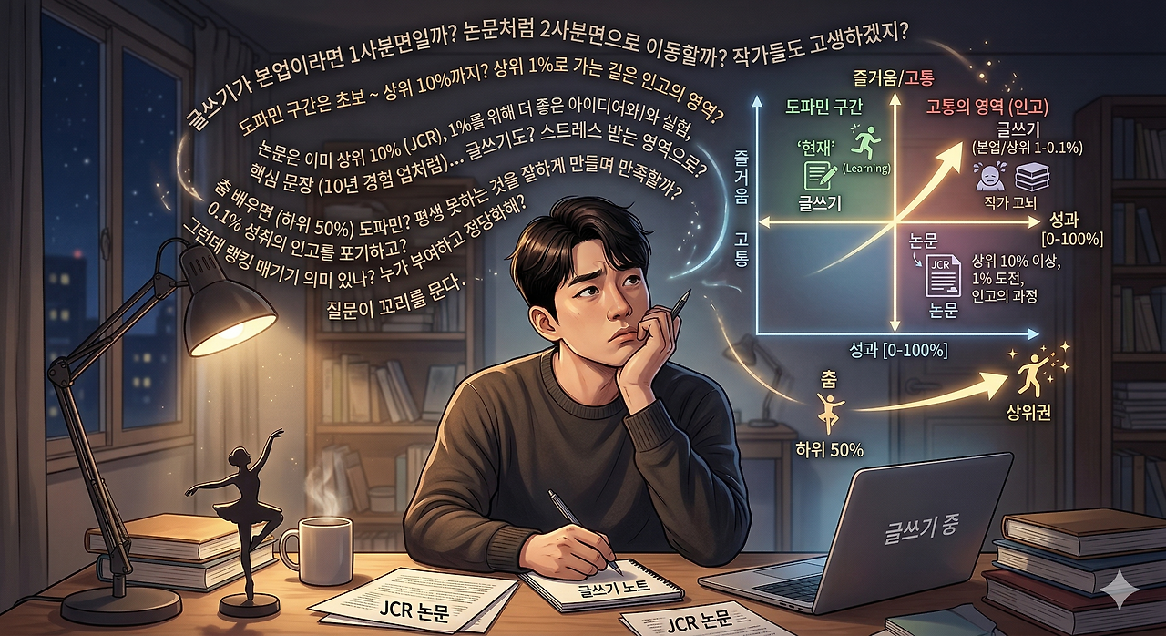 그러면 그 이후에 1%를 상위 0.1%로 올리려는 노력을 하지 않고 또 다른 영역에서, 가령 내가 하위 50% 미만의 영역인 춤추기를 배워서 잘하게 된다면 도파민이 터지게 되는 것은 아닐까. 그럼 나는 계속 평생을 잘 못하는 영역을 어느 정도 잘하는 영역으로 끌어올리면서 만족하고 살아야 하는가. 물론 폴리매스적인 사고로는 그게 옳다고 할 수 있지만, 인고의 과정 이후 상위 0.1%를 달성하며 누릴 수 있는 것들을 다 포기하게 되는 것은 아닐까.