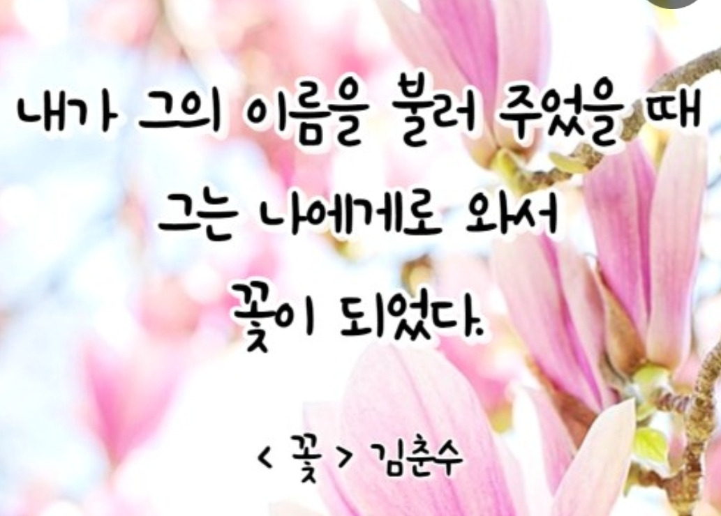 결혼 후 남들 부부가 부르는 여보 ~ 당신~자기야~이런 호칭을 남편에게서 단 한 번도 들어본 적이 없었습니다. 대신 남편은 대뜸 저의 이름을 부르며 덧붙여하는 말이 -내가 그의 이름을 불러주었을 때 그는 나에게로 와서 꽃이 되었다는 김춘수의 시 <꽃>을 읊었습니다.~너의 이름을 찾아라고 말입니다.
