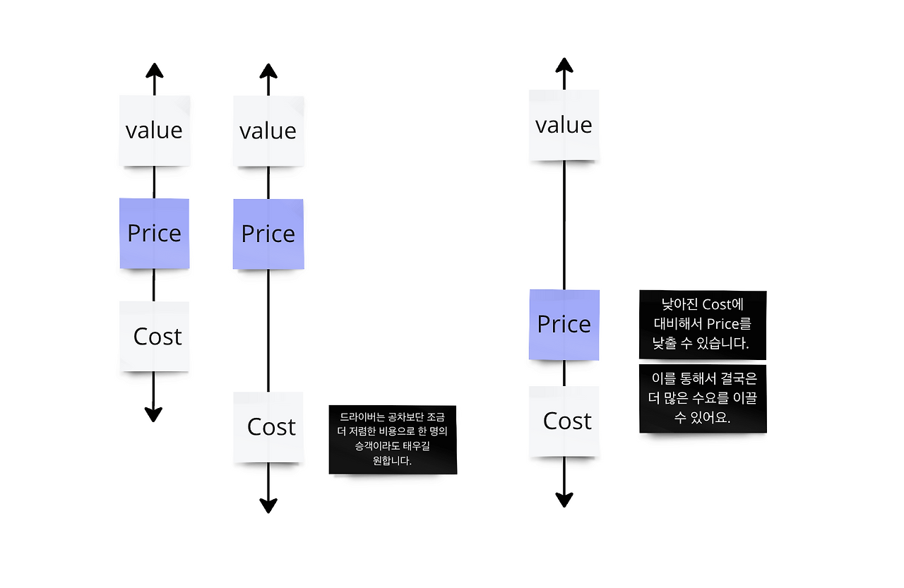 제품의 Cost가 고정되어 있다면, 단순히 Value만 고려해서 Price를 정하면 됩니다. 위에 나열했던 방법들처럼요. 반면 양쪽의 시장을 다 다루는 플랫폼은 사용자가 생각하는 가격 (Value) 그리고 드라이버가 생각하는 가격 (Cost)를 모두 고려해야 할 것 같습니다. Value와 Cost는 상황에 따라서 계속 바뀌기 마련이니까요.