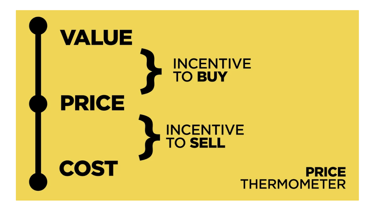 프라이싱 원칙에 대한 이야기를 먼저 해보려고 합니다. 리서치를 하다가 Price-Thermometer이라는 개념을 처음 알게 됐습니다. 이 개념은 Cost-Price-Value에 대한 관계를 설명하는 개념입니다.