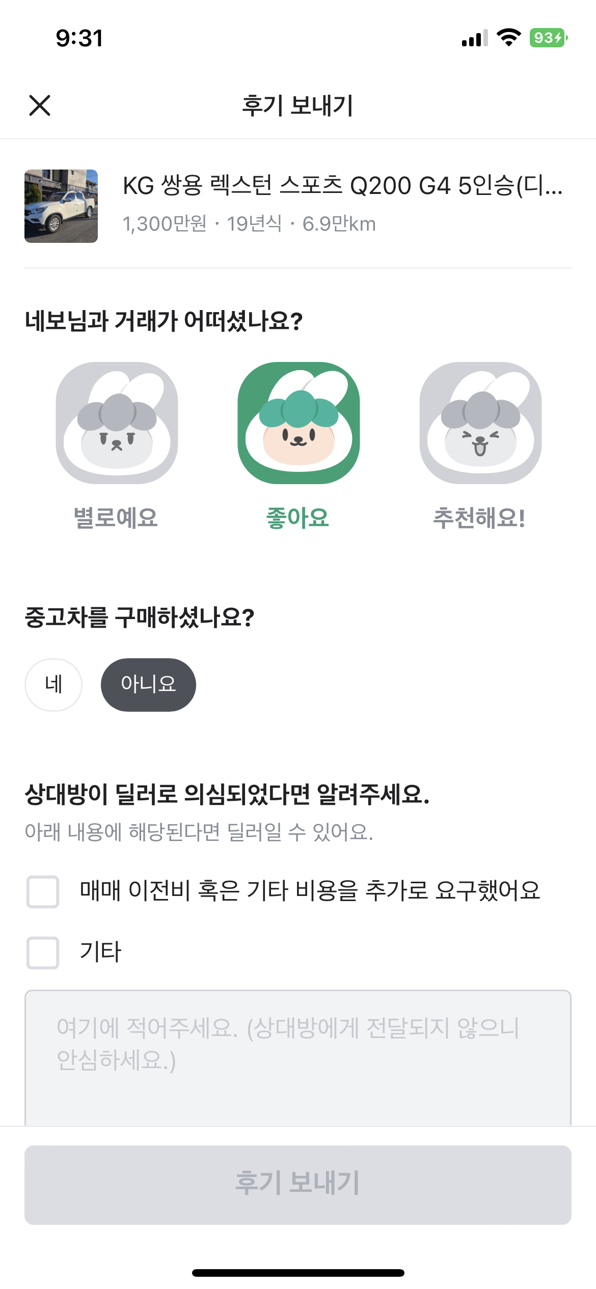 또한 일반 중고물품 거래와 다르게, 중고차 직거래에서는 구매를 하지 않아도 판매자에 대한 후기를 작성할 수 있어요.