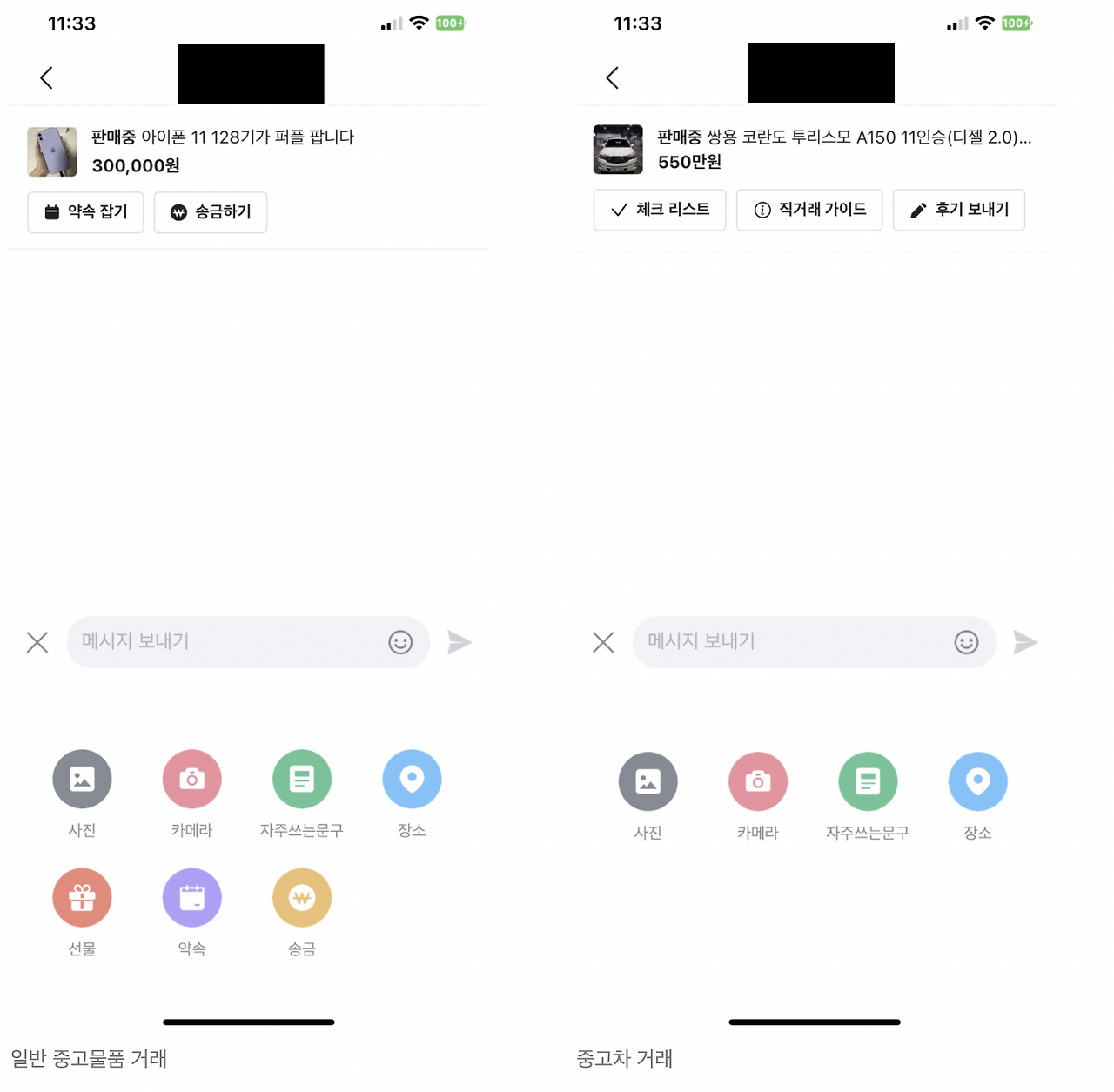 일반 중고물품 거래에서는 약속잡기나 송금하기 버튼을 둬서 편리하고 빠른 거래 성사를 유도한 것 같습니다.